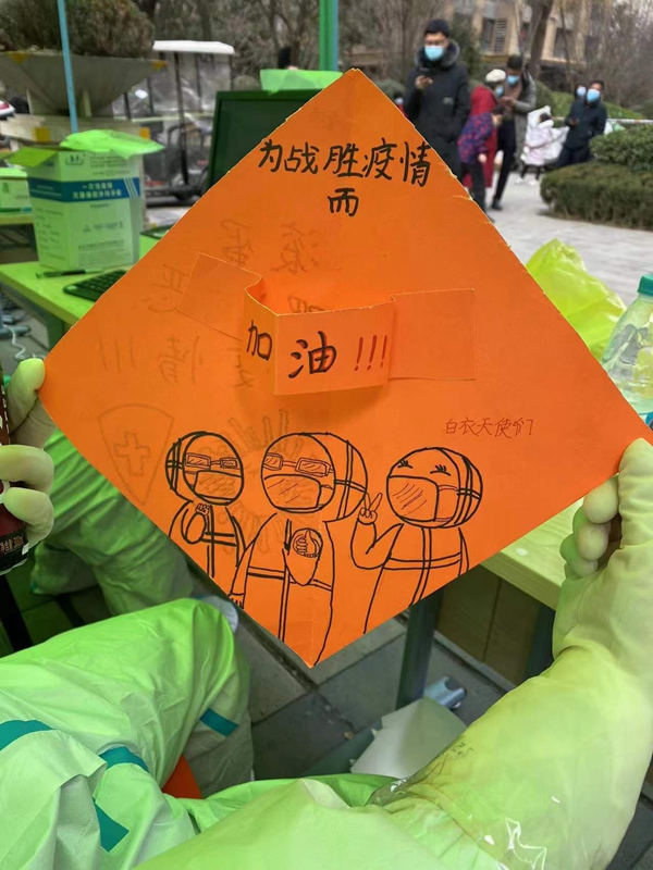 “这是小朋友送来的手工贺卡。因为每次做核酸的过程中,手上要不停喷酒精,做一个喷一,居民灌了好几大桶热水给我们暖手……”在郭杜街道书香路社区,配合完成5500位常驻居民核酸采样的新型能源公司郑智超,感动地说:“能够与这么一群优秀的医务工作者一起战斗倍感荣幸,我会做好防疫工作,为我们共同热爱的城市贡献一份陕煤力量。”